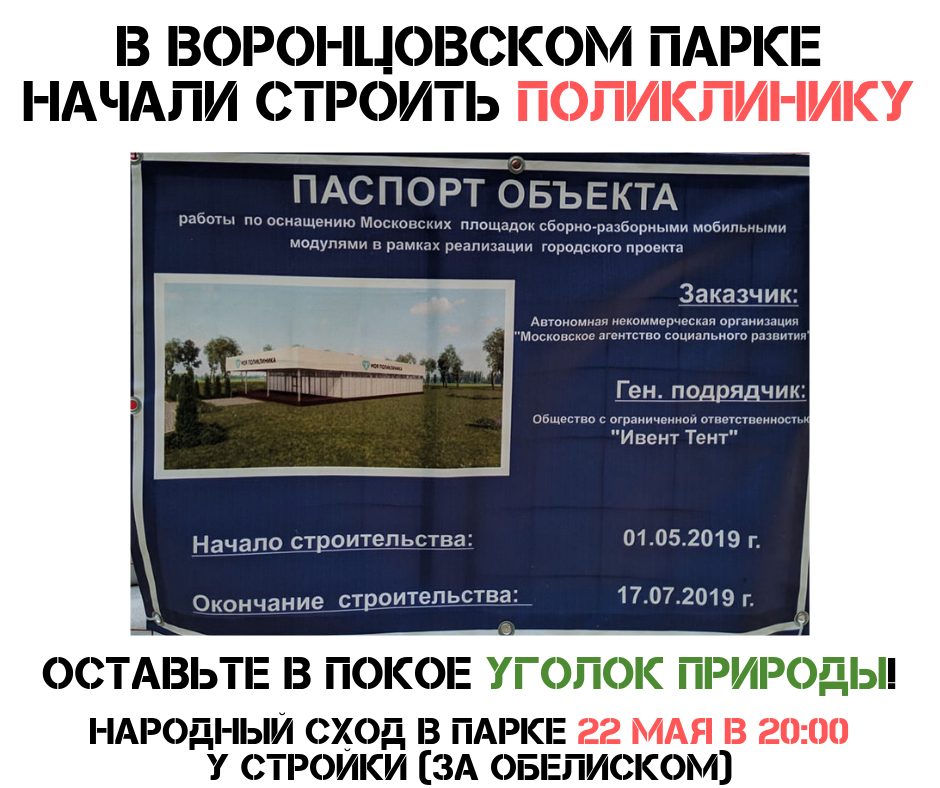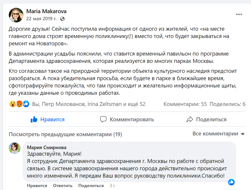 Однако, не очень понятно, что было делать дальше. У нас продолжалась долгая и трудная кампания по защите фруктового сада парка от вырубки под установку будки для ЛЭП. Начало в этих условиях еще одной большой кампании означало бы распыление и так скромных сил, поэтому мы решили ограничиться информированием жителей соседних районов с помощью публикаций в соцсетях, а также написанием обращений (с неприменным выкладыванием шаблонов в нашей группе) московским чиновникам.