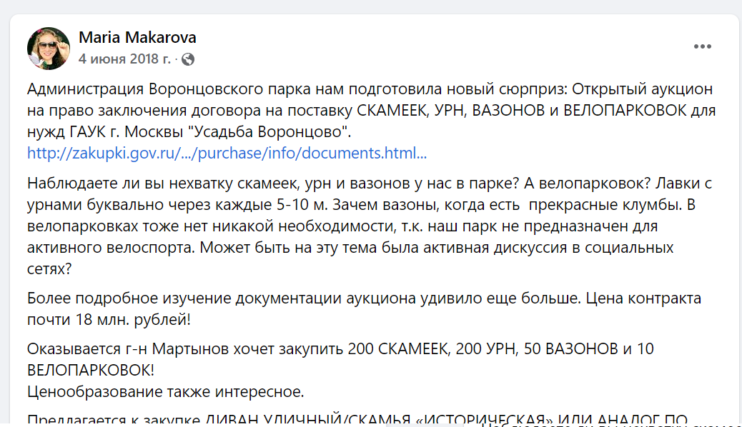4 июня 2018 года появилась информация о том, что дирекция Воронцовского парка собирается закупить т.н. “МАФы” – малые архитектурные формы: скамейки, вазоныи прочее. При прочих равных такая закупка вполне разумна, потому что балансодержатель парка должен следить за состоянием парковой инфраструктуры, чинить поломанное и заказывать новое на смену тому, что починить нельзя. Однако в этот раз закупка вызвала ряд вопросов: цены на некоторые позиции казались завышенными, а главное – в парке собирались разместить велопарковки.
