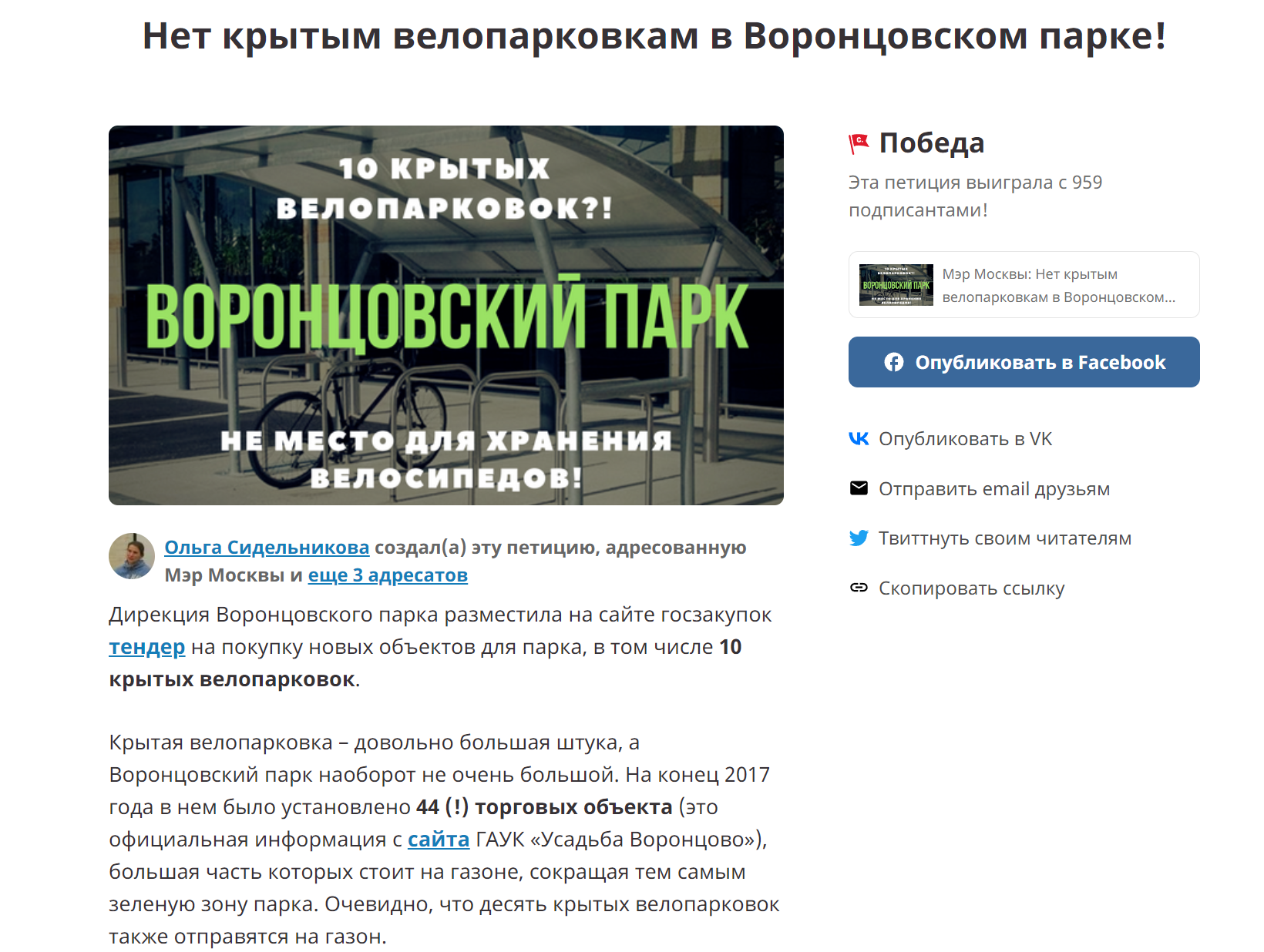 В результате спорную закупку отменили – 16 июня 2018 года была в группе “Оборона Воронцовского парка” появилась информация о том, что крытых велопарковок в парке не будет.